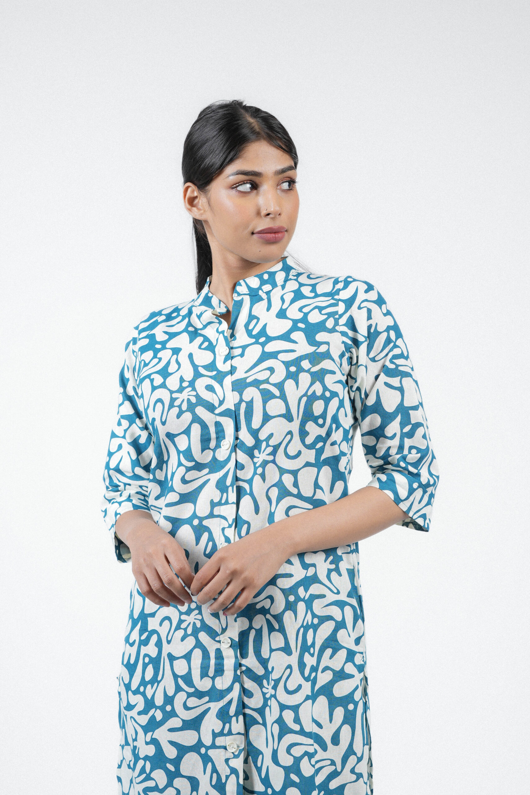 Step into effortless elegance with our Aqua Abstract Handblock Printed linen Co-ord Set. Crafted from soft, breathable linen, this coordinated set features a long kurta with a relaxed silhouette and matching wide-leg pants. The soothing aqua blue hue with abstract white motifs adds a touch of modern artistry to traditional handblock craftsmanship. Perfect for casual outings, office wear, or relaxed festive gatherings, this ensemble combines comfort with chic sophistication.