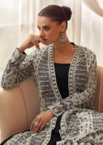 An elegant black floor-length gown paired with a beautifully embroidered ivory long jacket. The jacket features intricate traditional patterns with fine detailing, adding a luxurious and graceful look. Designed with a modest yet modern silhouette, this outfit is perfect for weddings, engagements, receptions, and special evening occasions. Crafted to give a classy, royal finish with a timeless appeal.