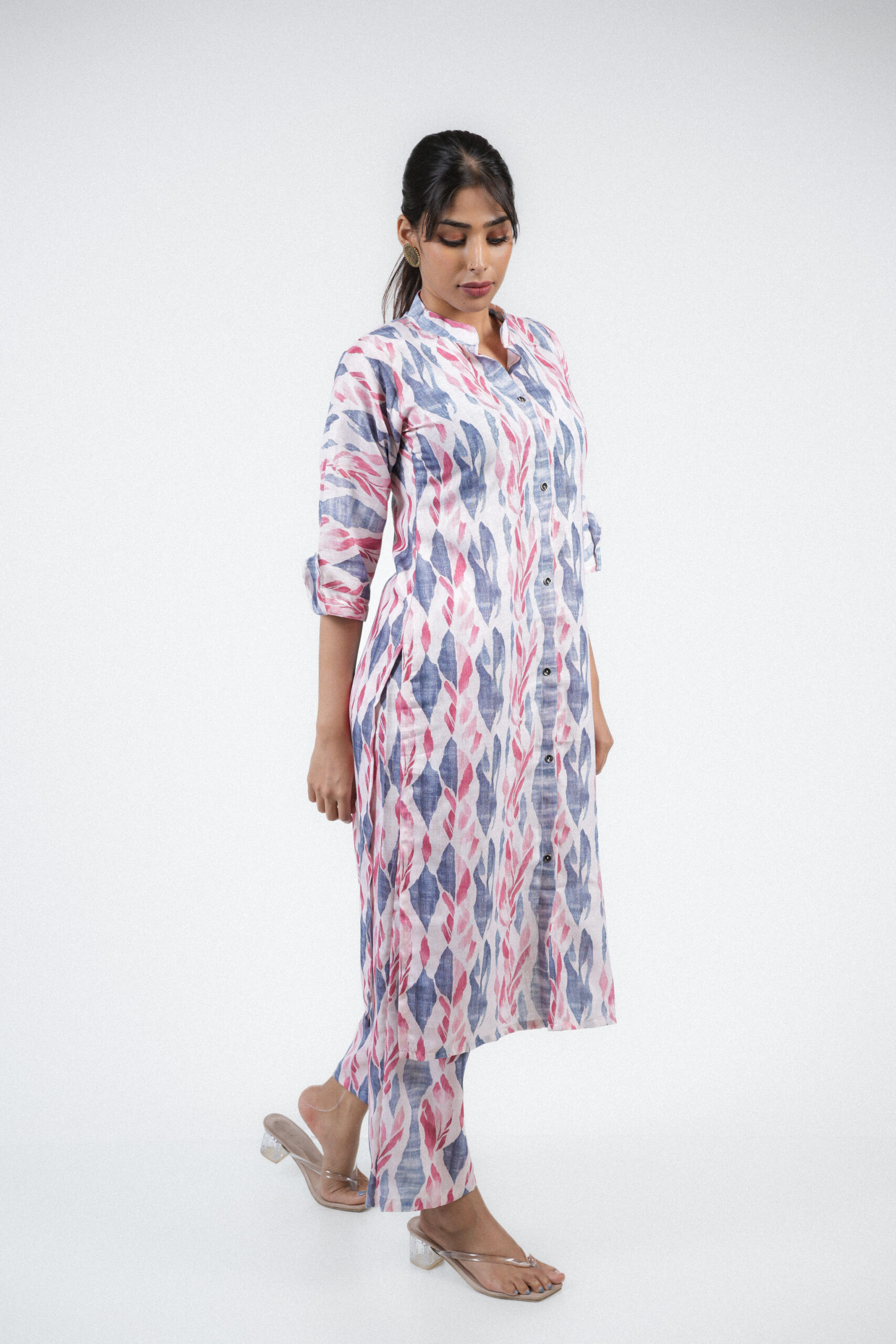 Radiate chic elegance with this pink and blue printed line silk co-ord set, designed to blend comfort with contemporary charm. Crafted from premium line silk fabric, it features soft floral and abstract prints that add a graceful vibrance to your look. Perfect for brunches, casual gatherings, or resort wear, this ensemble captures the essence of effortless sophistication with a modern twist.
