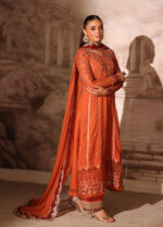 This exquisite salwar set comes in a rich burnt saffron shade, crafted from premium soft chiffon for a graceful fall and elegant silhouette. The kameez features intricate zari embroidery, delicate thread motifs, and scalloped detailing along the hem. Paired with matching embroidered trousers and a beautifully finished contrast maroon chiffon dupatta adorned with heavy zari borders, this ensemble brings together luxury, tradition, and timeless festive charm—perfect for weddings, events, and evening celebrations.