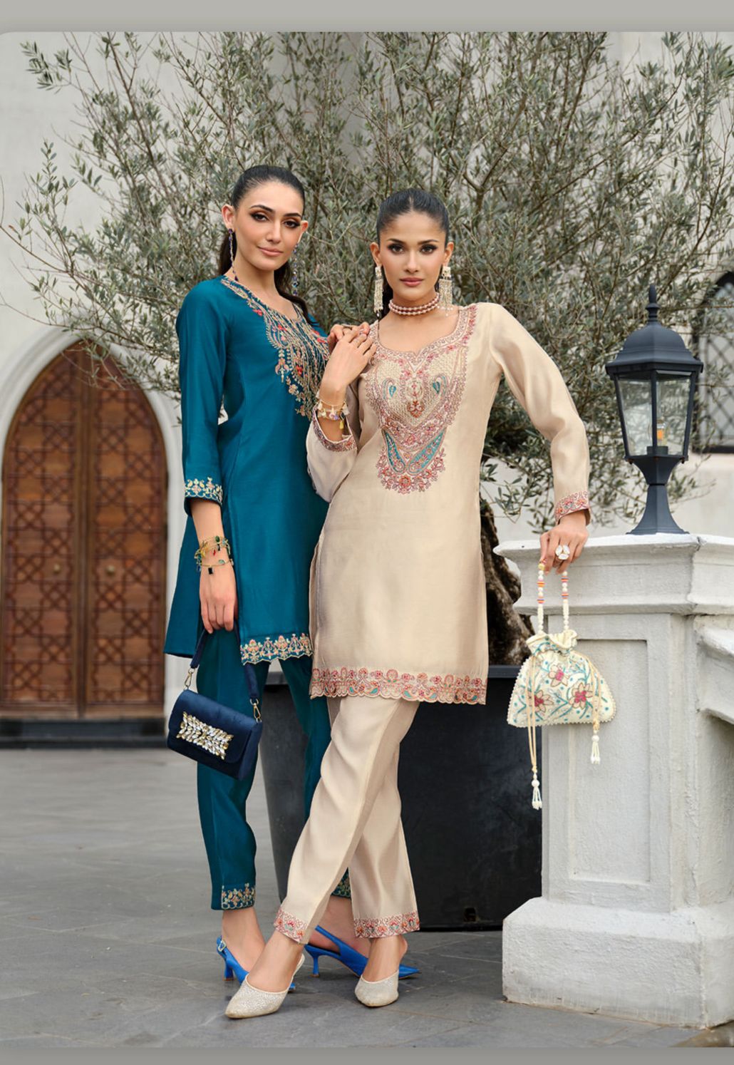 A sophisticated champagne beige co-ord set crafted from a soft cotton blend fabric, featuring intricate thread embroidery with subtle multicolor detailing on the neckline, sleeves, and hem. Perfect for elegant daytime occasions or festive gatherings.