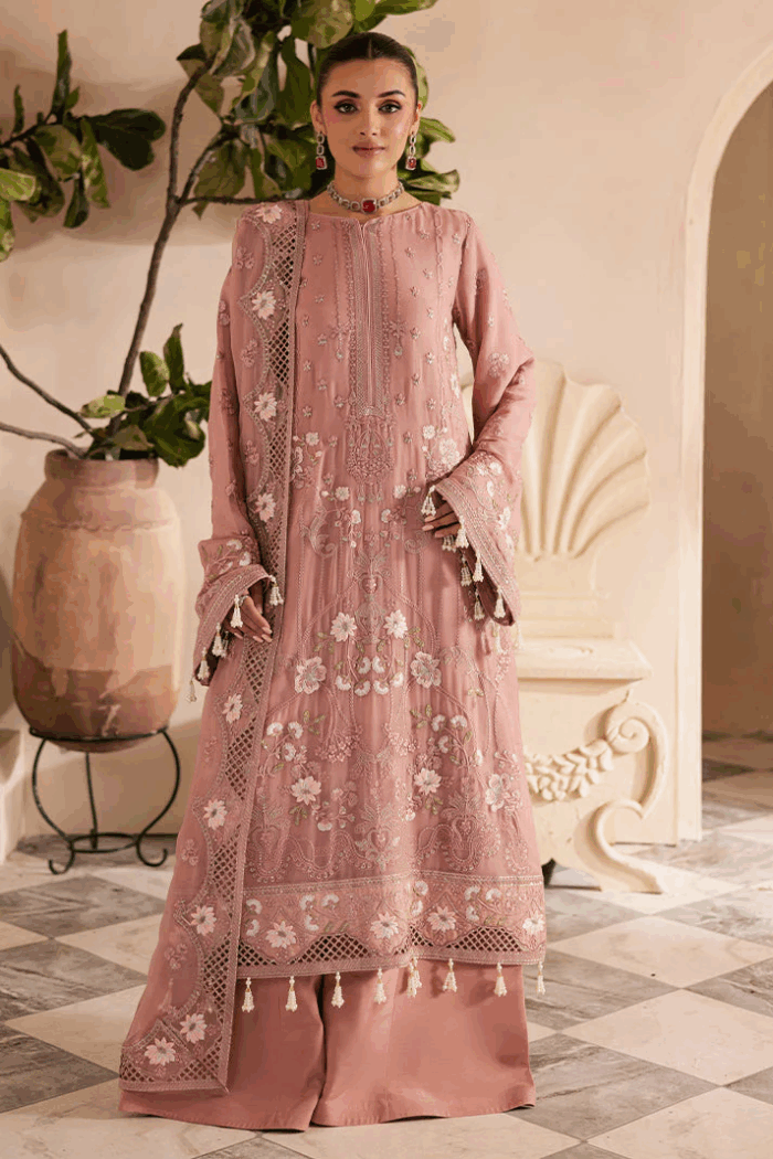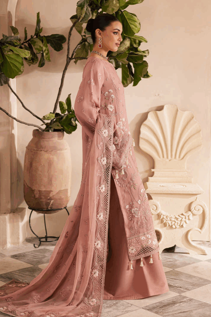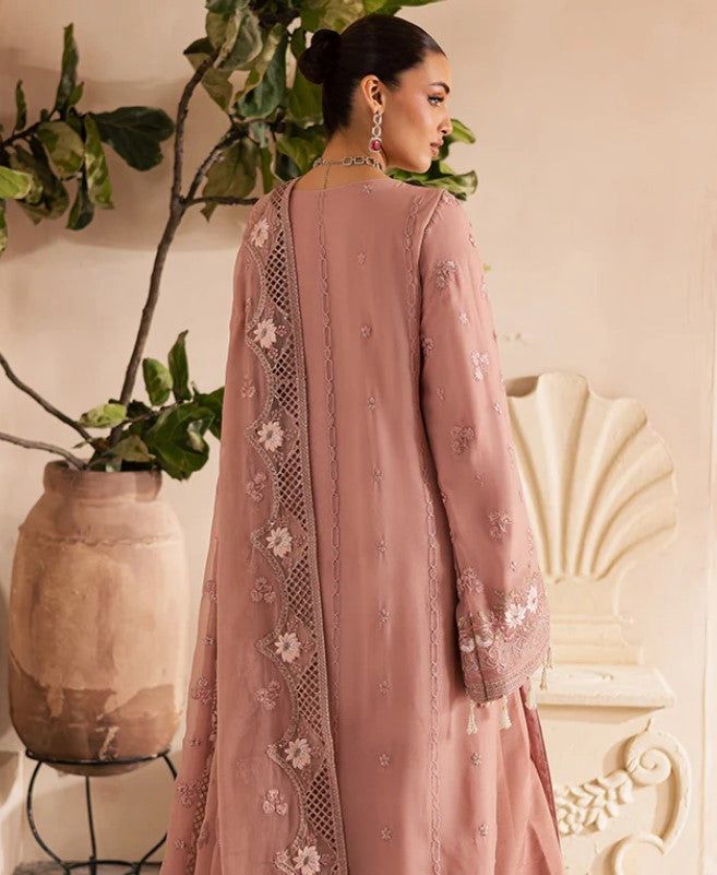 Elegant dusty rose chiffon salwar kameez featuring delicate floral embroidery, subtle sequin accents, and a beautifully detailed dupatta—perfect for festive and formal occasions.