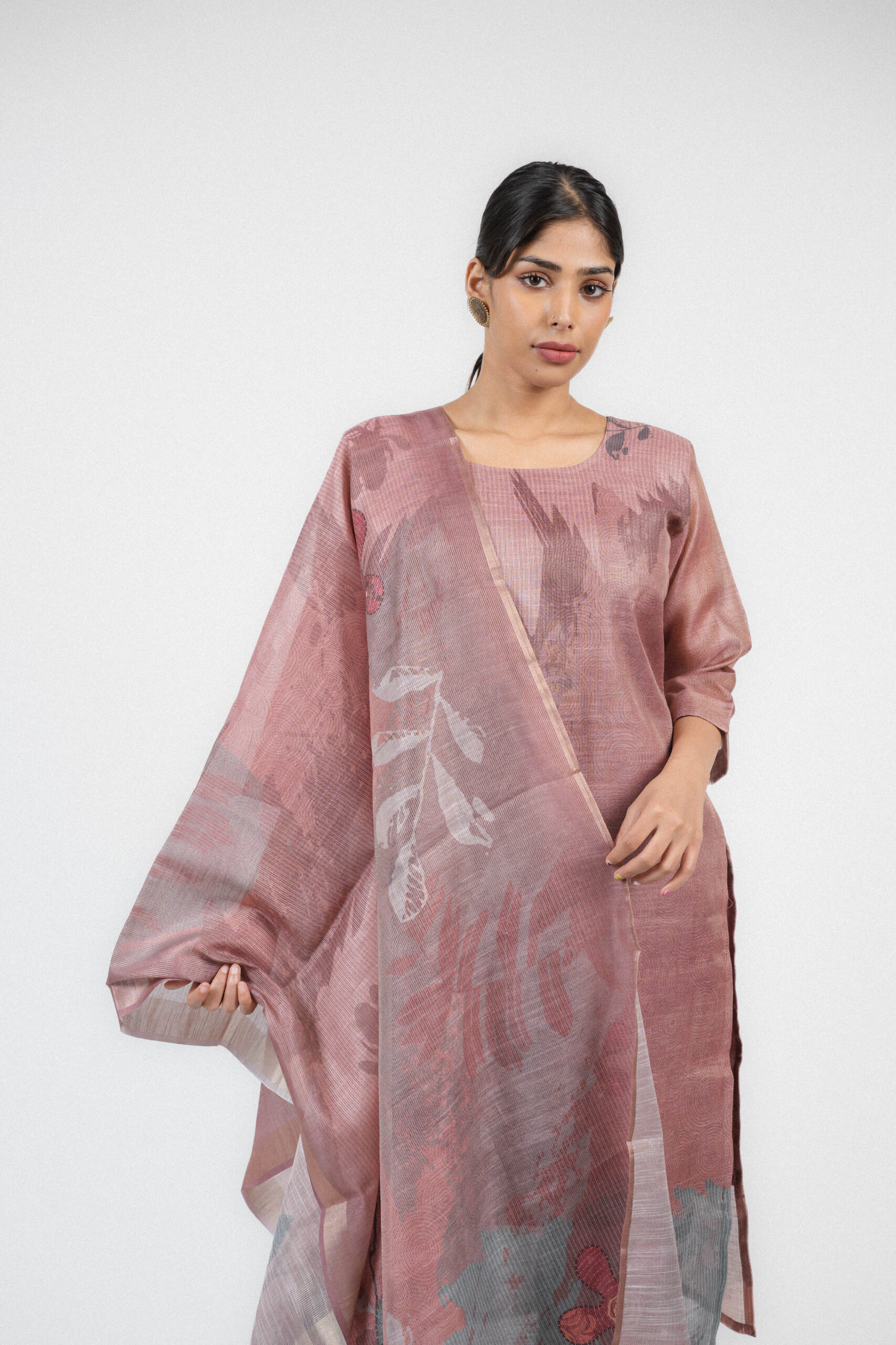Embrace understated luxury with the Ethereal Bloom Salwar Suit, exquisitely crafted in a serene dusty rose hue. The ensemble is rendered in pure organza, celebrated for its delicate translucence and graceful fall. Intricate handcrafted floral embroidery adorns the fabric, creating a harmonious blend of modern elegance and timeless artistry.