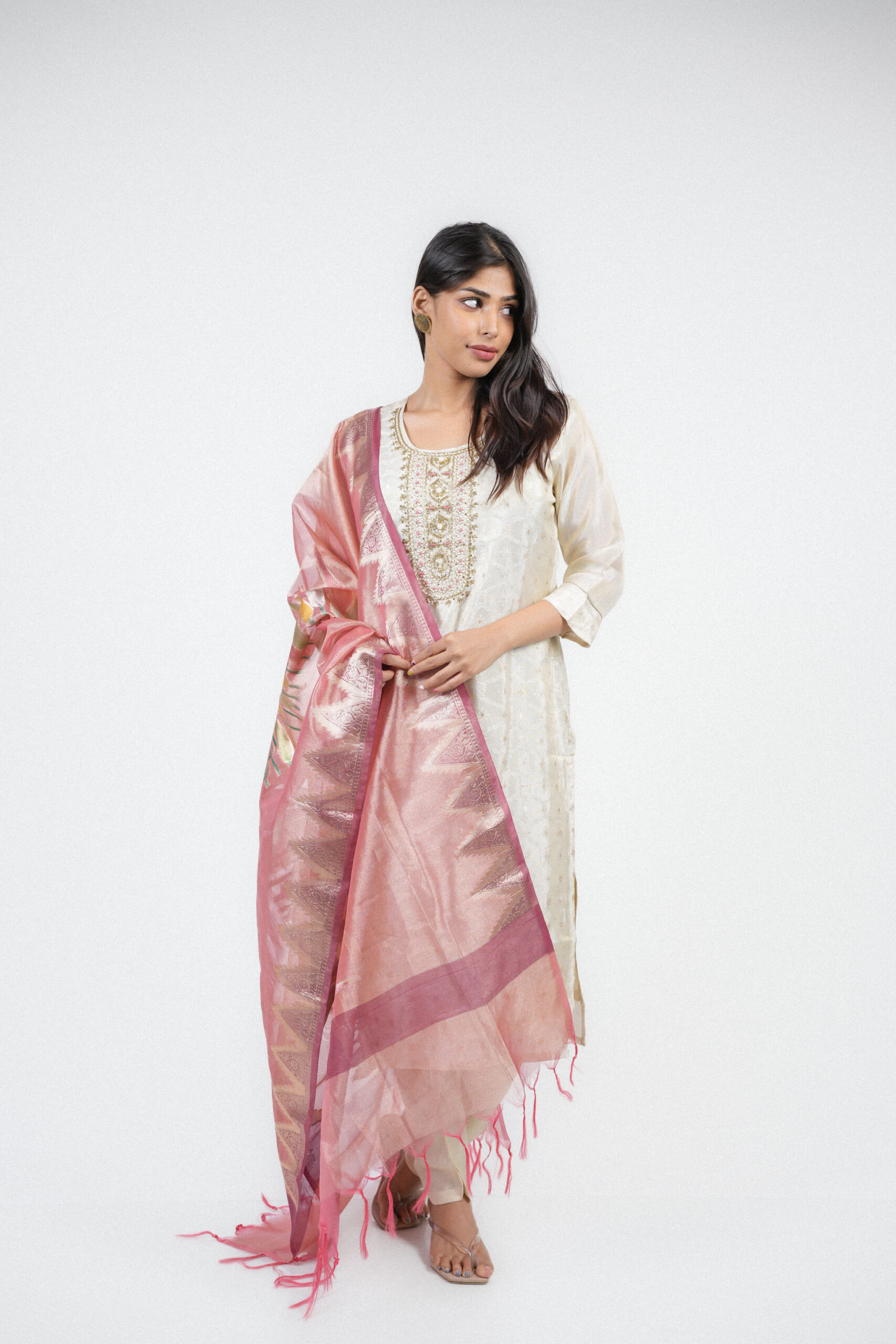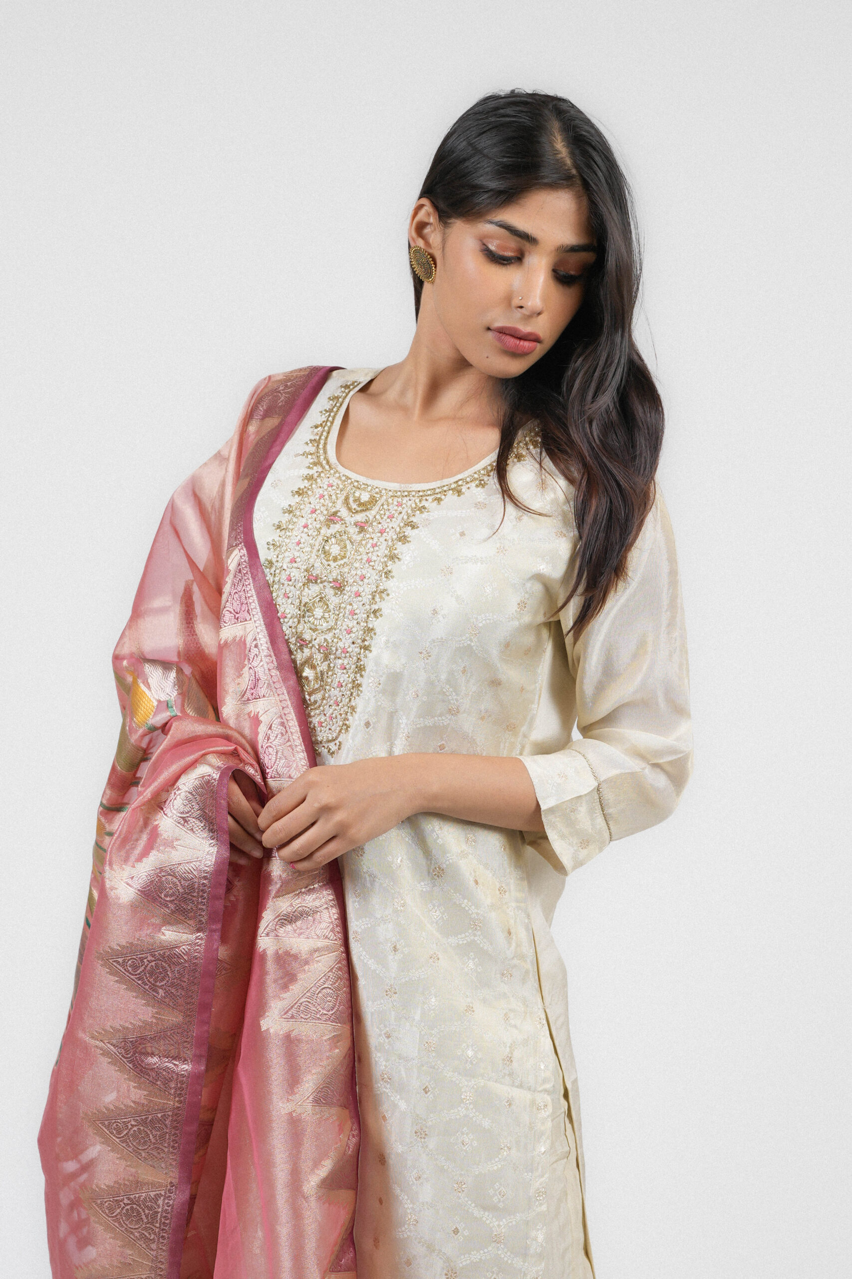An epitome of timeless elegance, Ivory Royale is crafted from rich Banarasi silk in a soft cream hue. The kurta features intricate zari embroidery along the neckline, paired with a blush-pink Banarasi dupatta adorned in gold zari weaving. A perfect choice for festive soirées and regal celebrations.