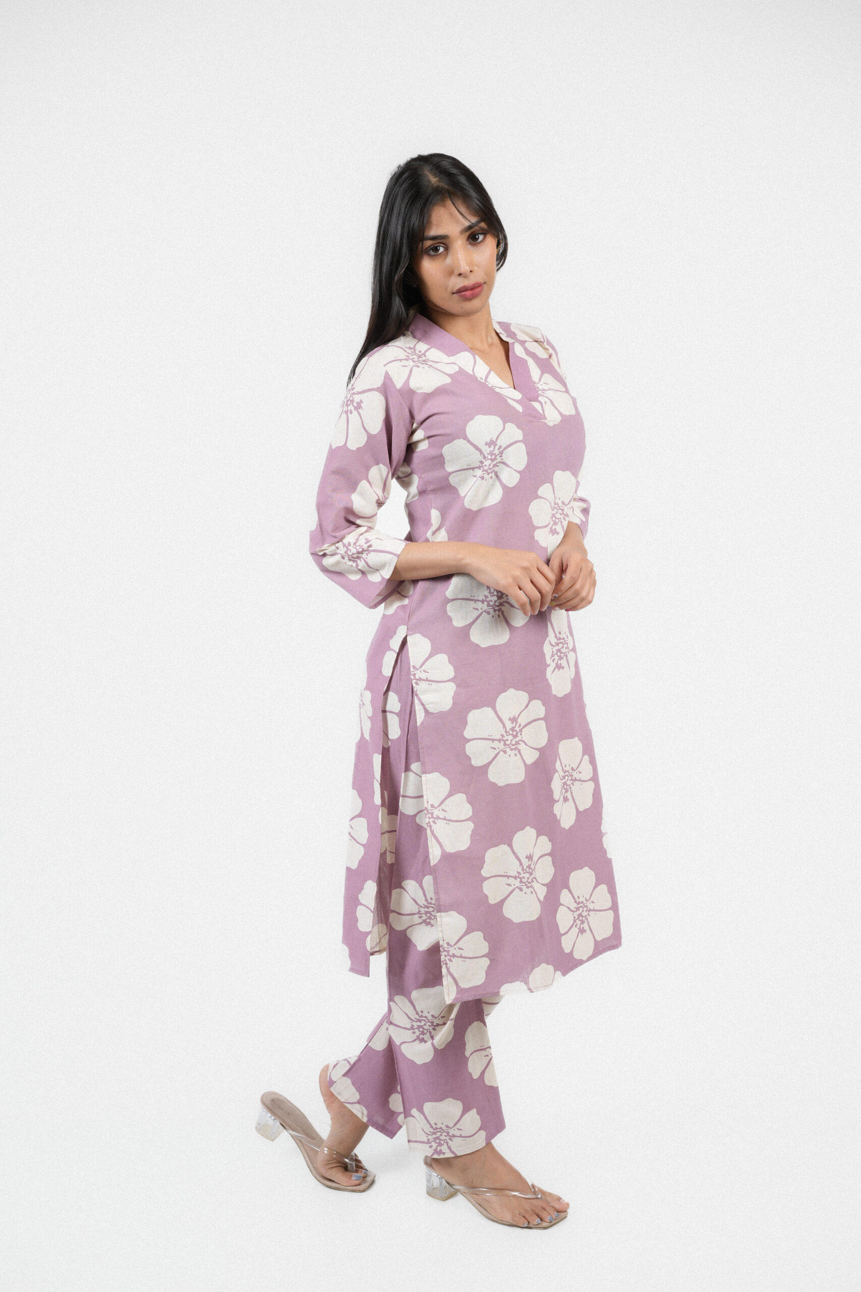 Breathe elegance into your everyday style with this charming lilac cotton co-ord set, featuring bold ivory floral prints that exude effortless grace. Crafted from premium soft cotton for all-day comfort, the set includes a V-neck kurta with three-quarter sleeves and matching straight-fit pants. Perfect for brunches, resort getaways, or relaxed evenings, this ensemble blends comfort