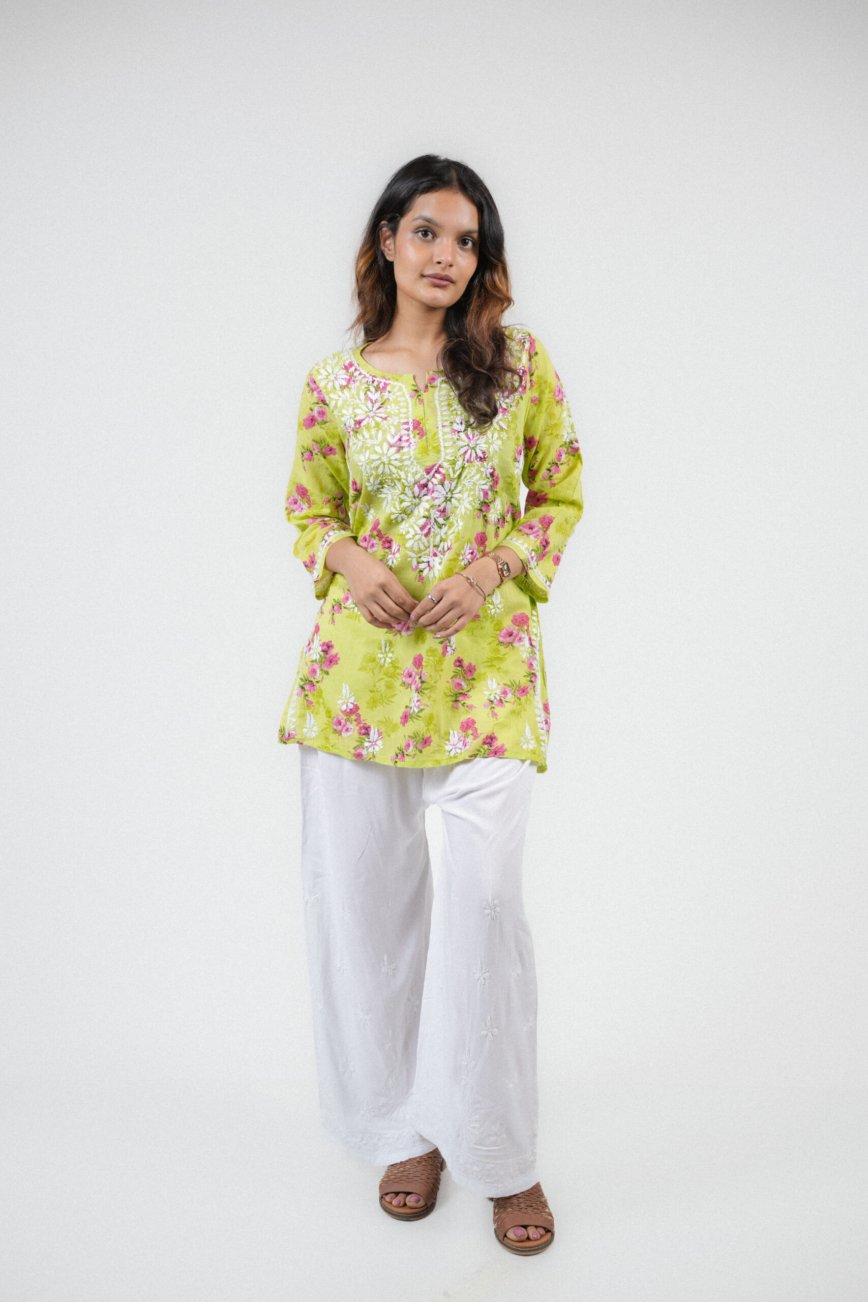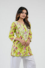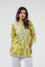 This beautiful lime green kurti is crafted from soft cotton fabric, adorned with delicate white chikankari embroidery on the yoke and sleeves. The charming pink floral print adds a feminine touch, making it a perfect blend of comfort and elegance for everyday and festive wear.