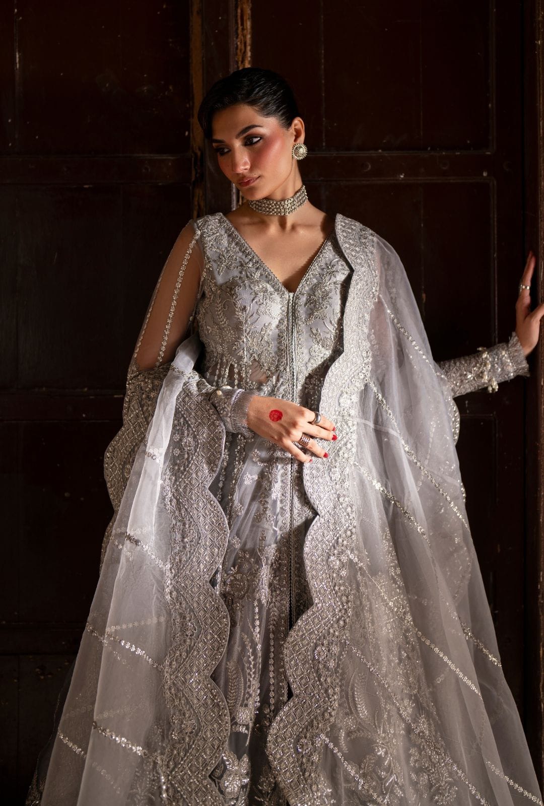 This elegant Moonlight Silver Embroidered Anarkali Ensemble is a perfect blend of timeless tradition and refined luxury. Crafted in a soft silver-grey tone, the outfit features intricate all-over embroidery that adds depth and richness to the silhouette. The flowing Anarkali is paired with a beautifully detailed matching dupatta, finished with delicate borders that enhance its graceful fall. Ideal for weddings, receptions, and grand festive occasions, this ensemble exudes sophistication and charm, making it a standout choice for those who appreciate classic elegance with a modern touch.