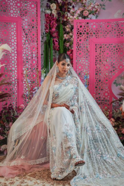 Ivory Satin Silk Saree With Sequin & Thread Embroidery Work