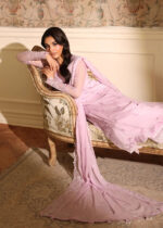 Rosy Orchid Luxe Pakistani Salwar Set features a soft pink chiffon-blend fabric adorned with delicate thread embroidery and lace detailing throughout. The long straight-cut kameez showcases refined neck work, intricate sleeve embroidery, and a beautifully scalloped hem with bead tassels. Paired with a matching trouser and a lightweight embroidered dupatta, this elegant set brings a graceful, premium Pakistani festive look.