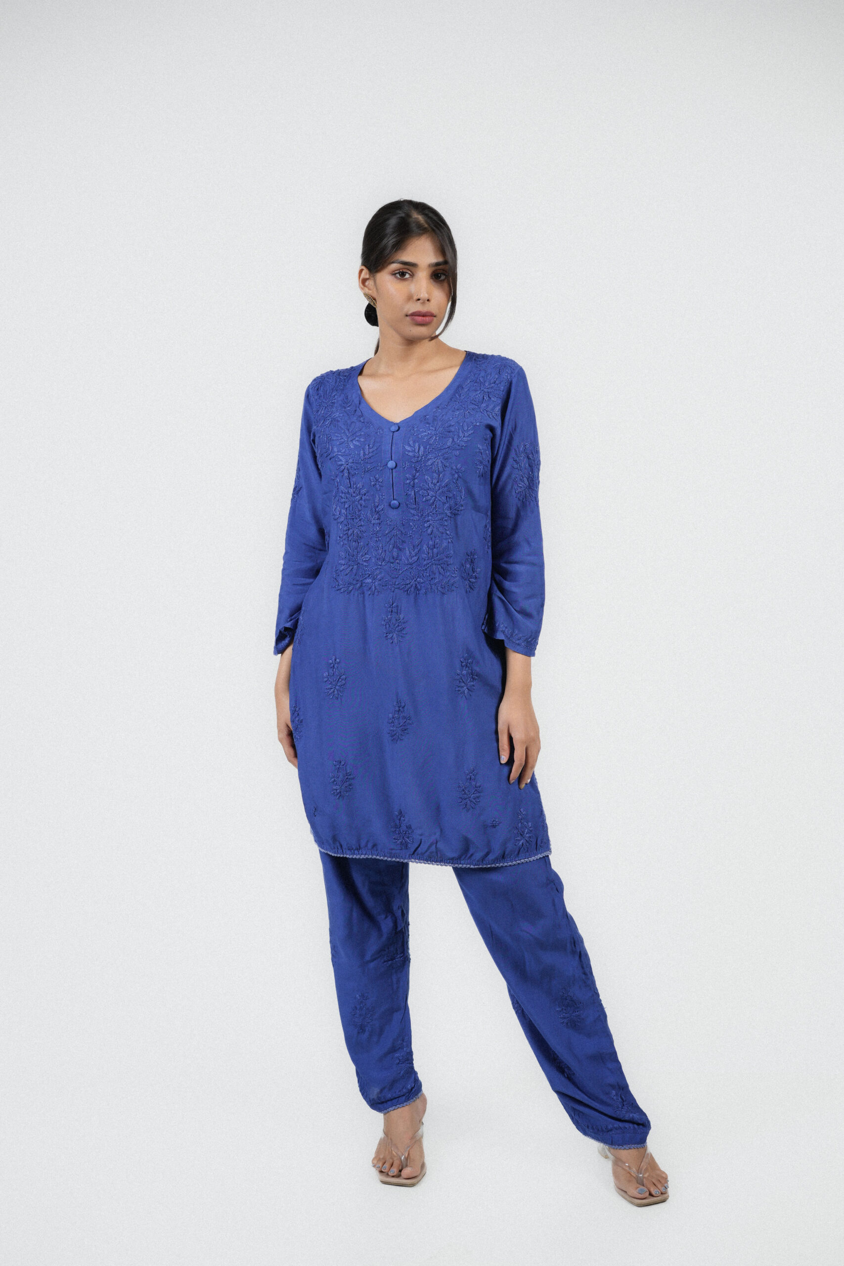 Step into elegance with this royal blue co-ord set, beautifully crafted from soft rayon fabric. Featuring intricate tonal Chikankari embroidery, this ensemble blends traditional charm with a contemporary silhouette—perfect for festive celebrations or refined everyday wear.