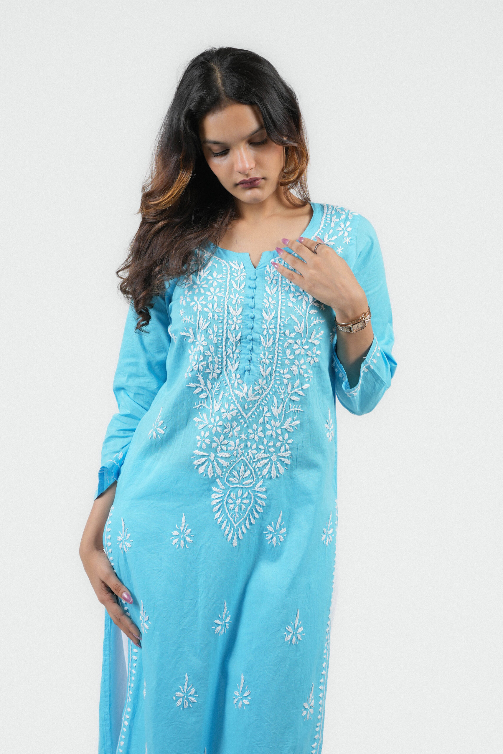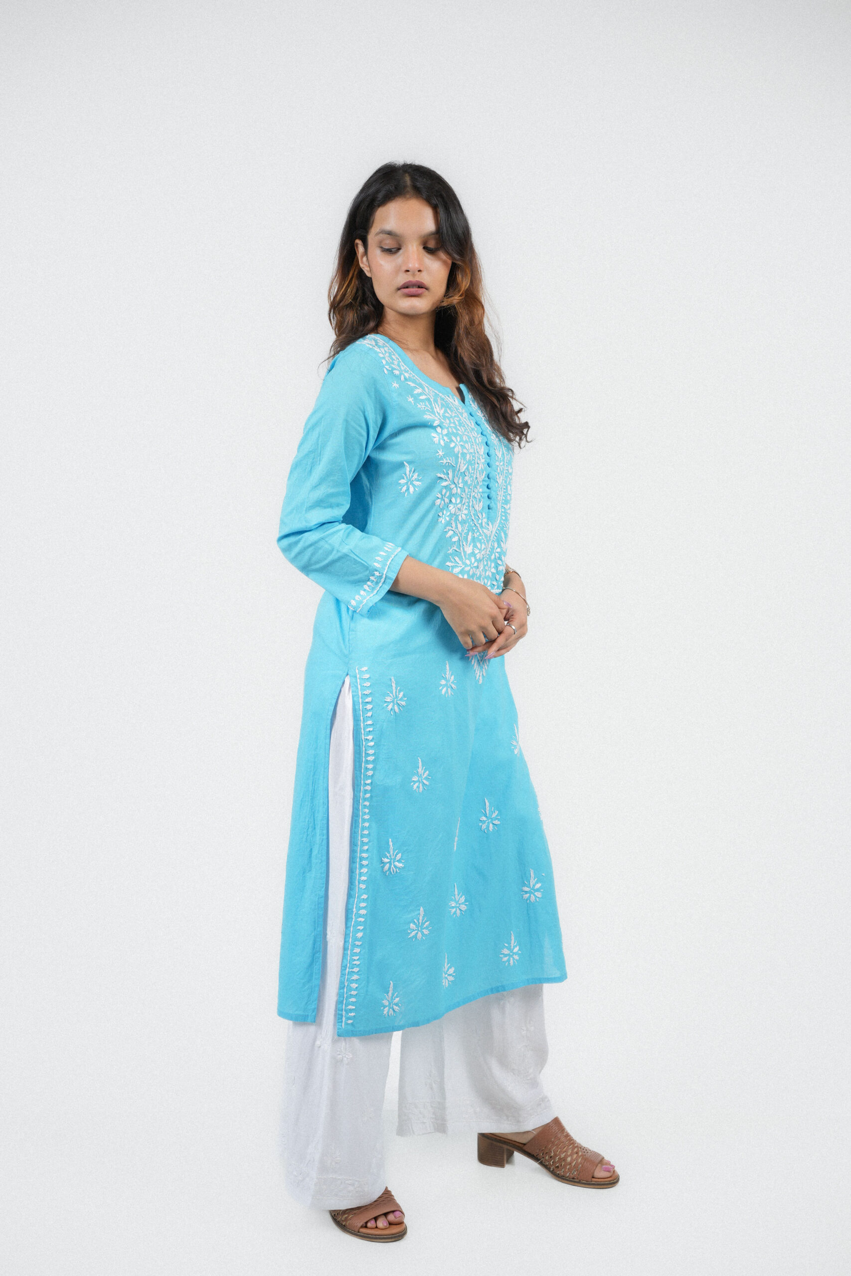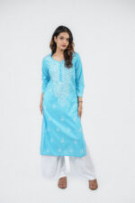 This elegant sky blue kurta features exquisite white Chikankari embroidery that adds timeless grace to your look. Crafted from soft, breathable fabric, it blends traditional craftsmanship with modern comfort—perfect for both casual and festive occasions.