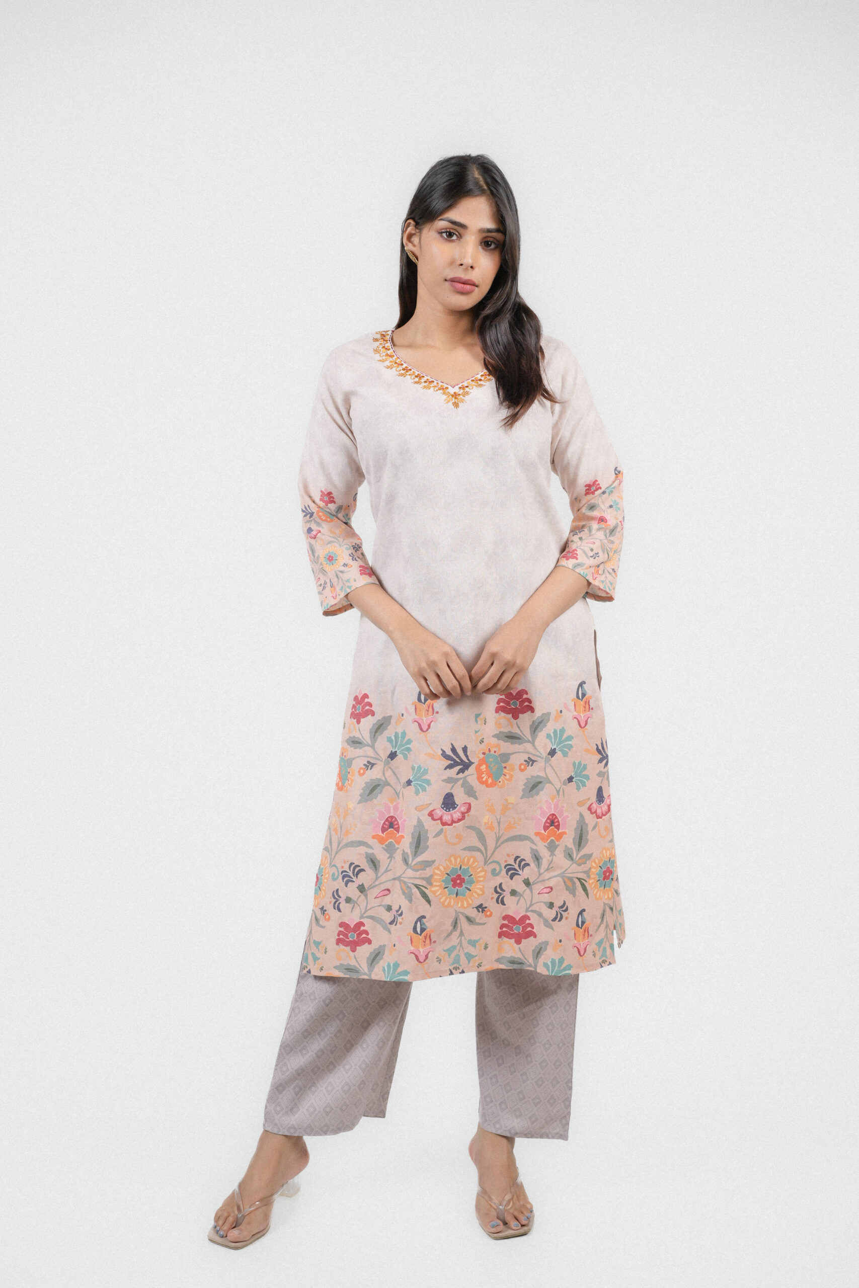 Grace your look with understated elegance in this soft beige linen co-ord set, beautifully adorned with delicate floral embroidery in hues of coral, teal, and mustard. The V-neckline detailed with intricate threadwork adds a touch of sophistication, while the subtle printed trousers complete the ensemble with effortless charm. Perfect for refined daytime outings or elegant evening gatherings, this set embodies timeless grace with modern comfort.