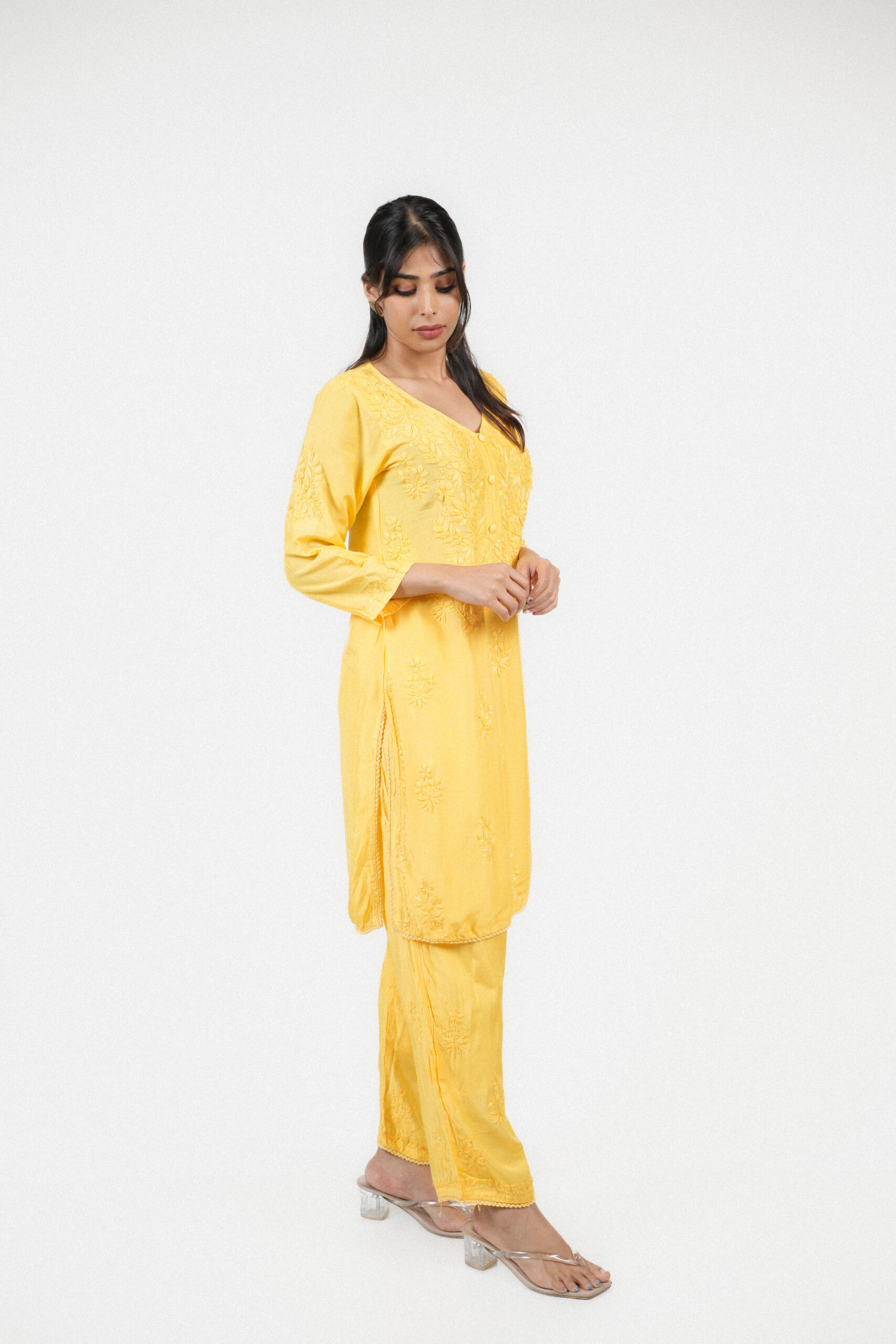 Radiate charm in this sunshine yellow co-ord set, crafted from soft and flowy rayon fabric. Adorned with intricate tonal Chikankari embroidery, this elegant ensemble blends traditional craftsmanship with modern comfort—perfect for festive gatherings or elegant day outings.