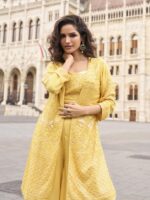A graceful fusion outfit in sunshine yellow, crafted from lightweight georgette fabric. This stylish set features embroidered thread and sequin work on a front-open long jacket, paired with a matching embroidered crop top and flowy palazzo pants. The perfect blend of modern chic and ethnic elegance — ideal for festive occasions or daytime celebrations.
