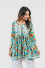 Refresh your ethnic wardrobe with this stunning teal green soft cotton kurti, featuring exquisite white chikankari embroidery on the front. The vibrant multicolor floral print lends it a cheerful vibe, while the breathable cotton fabric ensures all-day comfort. A perfect pick for casual outings and relaxed festive looks.
