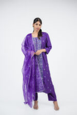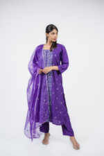 Elegant and refined, this purple silk linen salwar set features intricate embroidery that adds a touch of sophistication. The soft sheen of silk linen enhances its graceful drape, making it perfect for festive gatherings or elegant daytime wear.