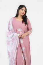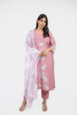 Elevate your style with our Blush Serenity dupion silk salwar set. Adorned with delicate white floral embroidery, this ensemble blends timeless grace with modern elegance. The soft dusty rose hue, paired with a printed chiffon dupatta, makes it ideal for festive soirées, family gatherings, or elegant daytime outings.