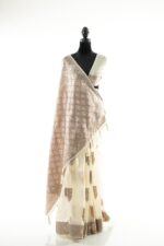 Elegant classic beige Dupion silk saree adorned with intricate gold embroidery. The timeless design and luxurious fabric exude sophistication, making it perfect for special occasions. The subtle beige tone paired with golden accents adds a touch of understated glamour.