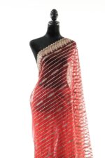 Elevate your wardrobe with the Ethereal Red Net Saree, beautifully crafted from delicate net fabric and embellished with intricate golden zari work. This striking red saree is perfect for festive occasions and special events, offering a graceful blend of tradition and contemporary elegance. Adorn yourself in this exquisite piece and make a stunning statement wherever you go.