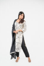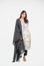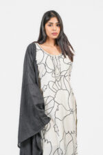 A timeless ensemble in ivory and black, this modal silk salwar set showcases a bold floral-printed kurta enhanced with handcrafted mirror and sequin detailing along the neckline. Paired with a black modal silk dupatta, this outfit blends minimal elegance with artisanal charm — perfect for festive soirées or refined daytime occasions.