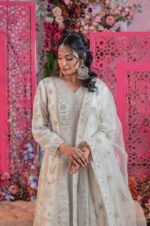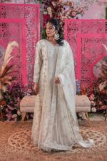 This Ivory Sequin and Thread Embroidered Bridal Dress exudes timeless elegance and grace. Crafted in a flowing Anarkali silhouette, the outfit features delicate silver thread embroidery and subtle sequin work that adds a soft shimmer to the ensemble. Paired with a sheer dupatta adorned with matching embroidery, this dress is a perfect choice for brides who prefer a sophisticated, understated look for their special day.