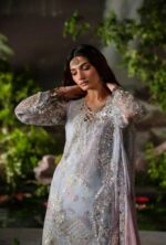 This exquisite Pakistani luxury salwar suit comes in a soft ice-blue / pastel silver shade, enhanced with intricate hand embroidery, zari work, crystal embellishments, and fine thread detailing.