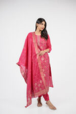 A stunning blend of traditional charm and modern elegance, this rose pink Banarasi silk salwar set features intricate zari weaving highlighted with delicate sequin embellishments. The rich Banarasi silk fabric lends a regal sheen, making it perfect for festive celebrations, weddings, or special occasions.
